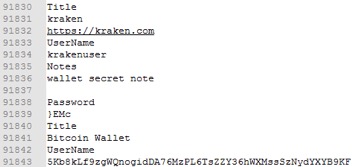 Strings encapsulated by a ‘<input hwnd=’ tag will allow us to enumerate all secret entries that have been interacted with. Below, Figure 20, is an example of extracting a private key to a bitcoin wallet.